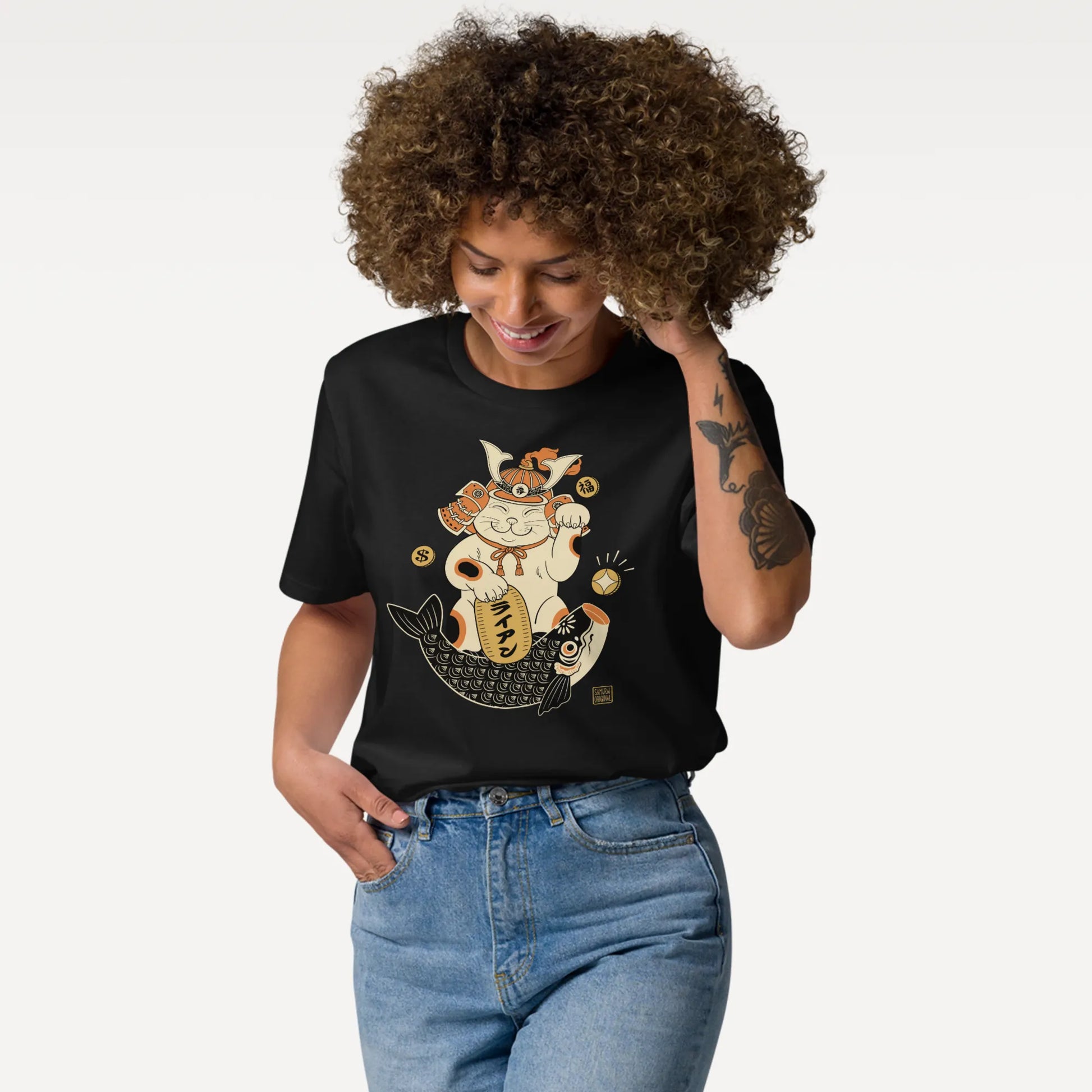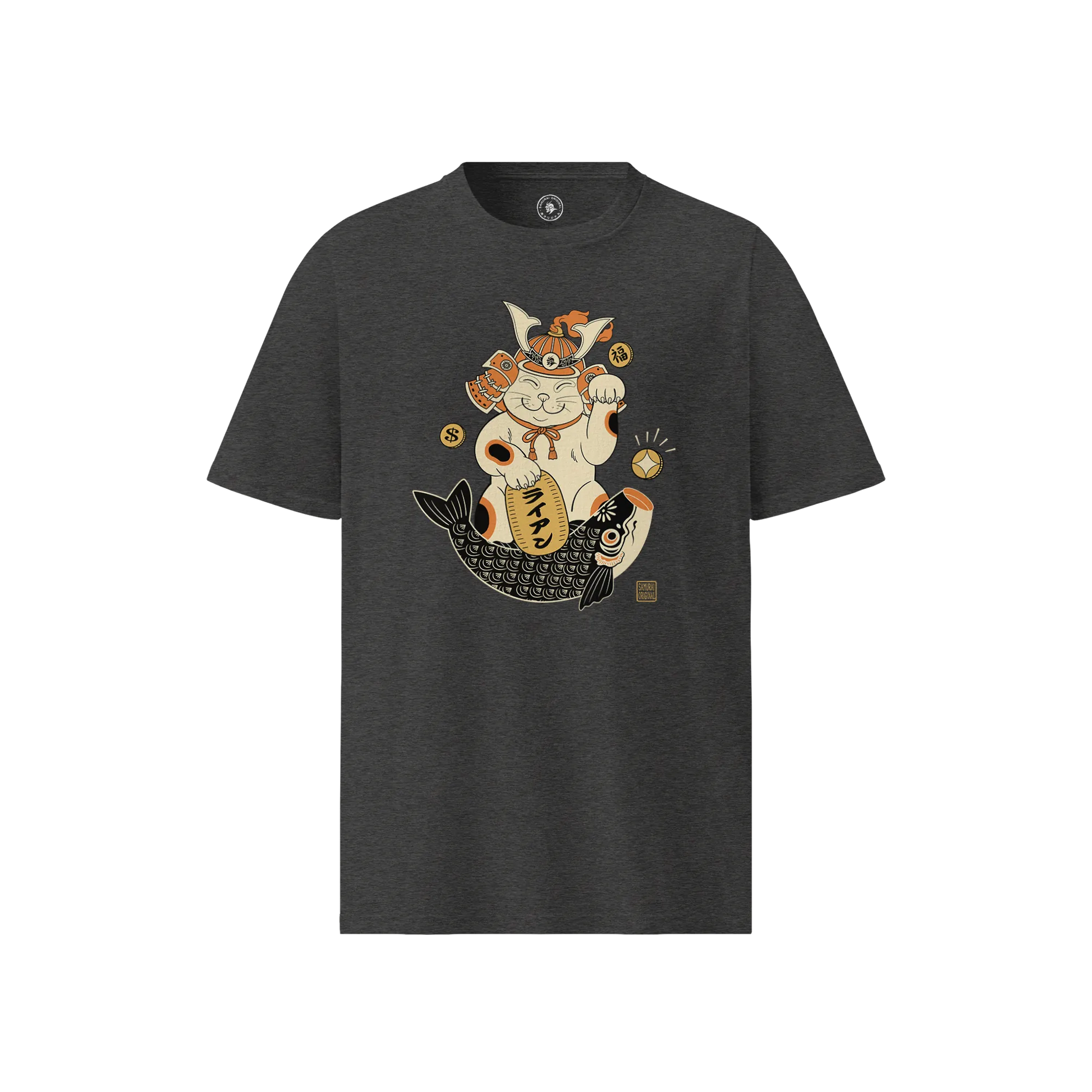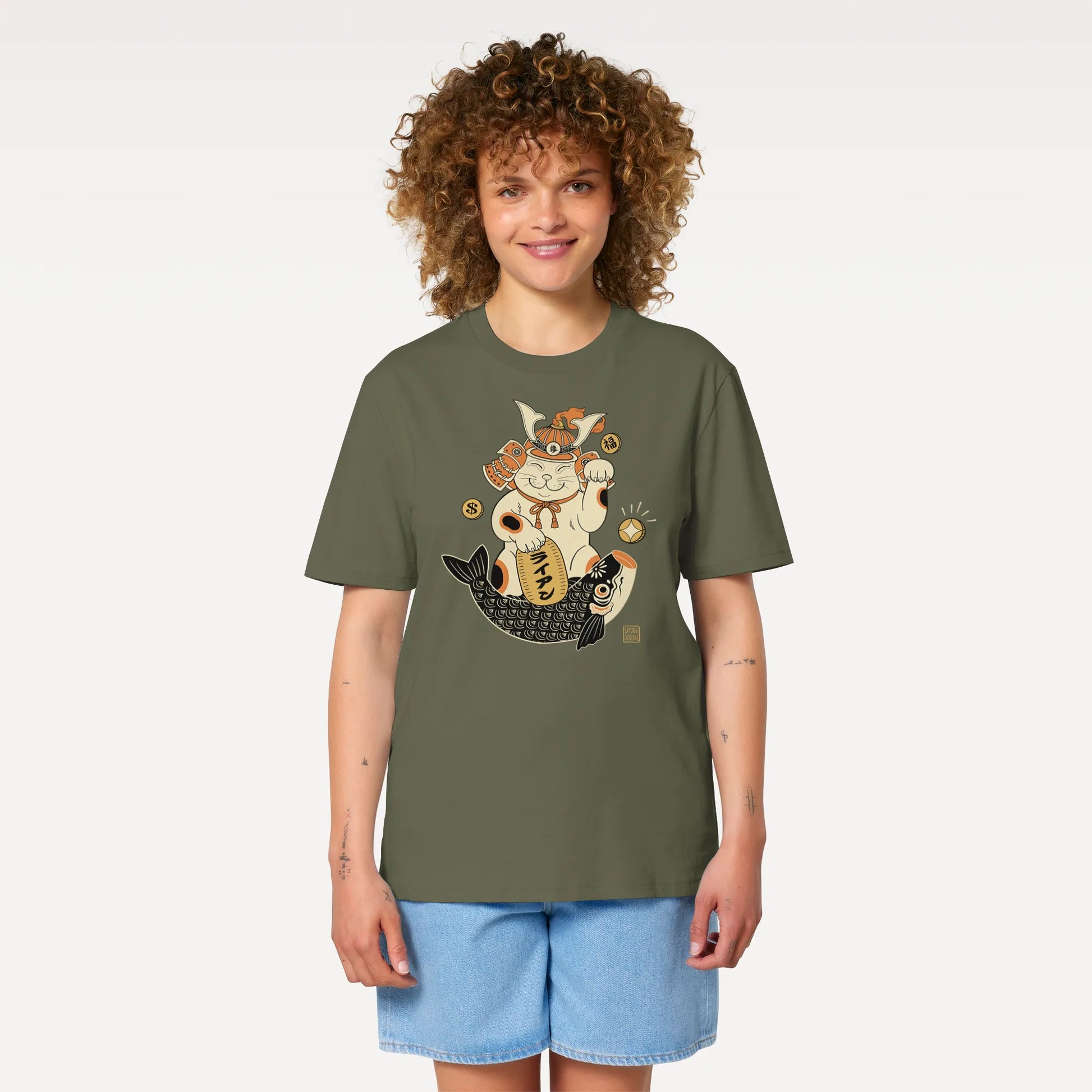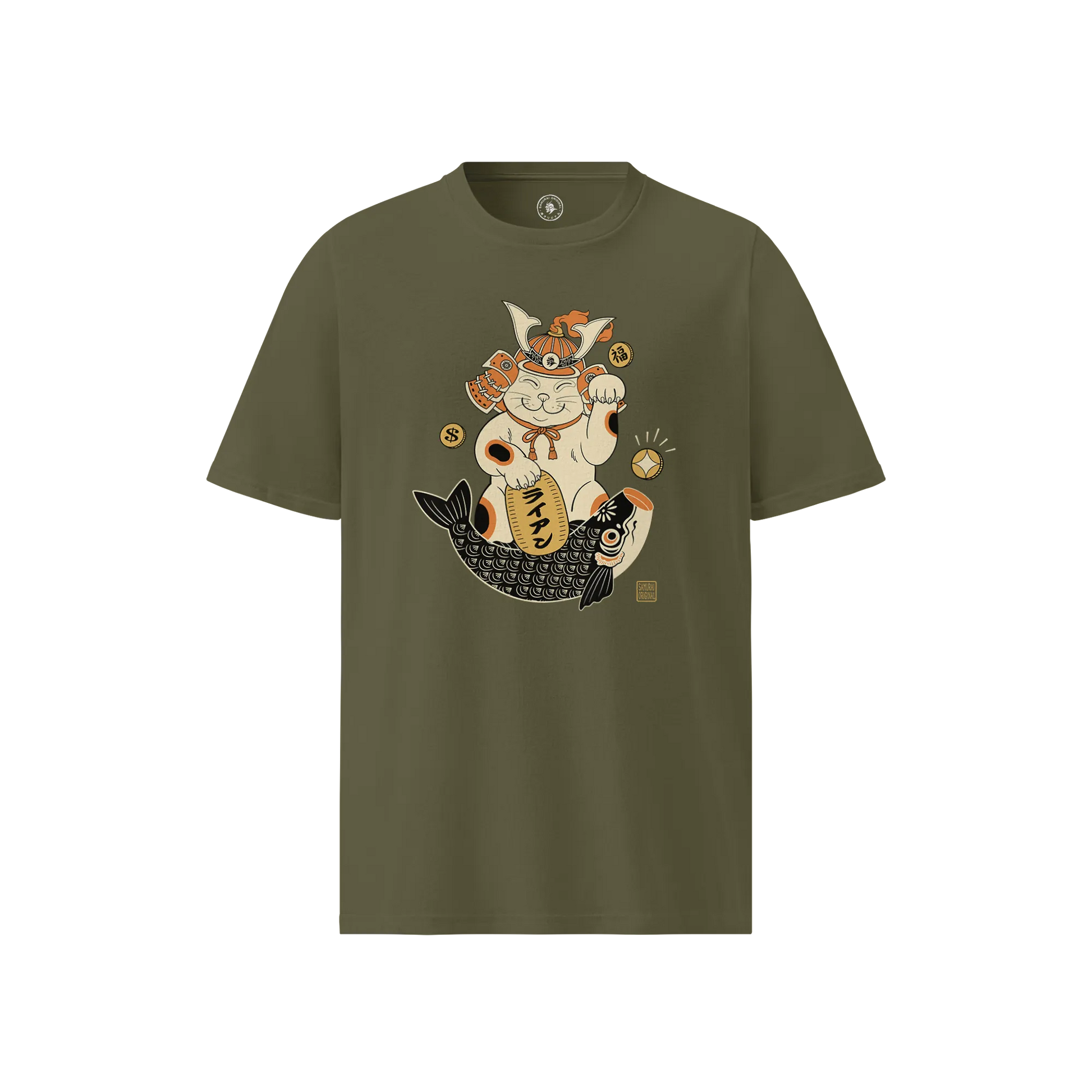 The Custom Name Maneki Neko Unisex Organic T-shirt No.1 blends Japanese tradition with a modern twist. Featuring the iconic 招き猫 (Maneki Neko) — the Lucky Cat — holding a koi fish and surrounded by gold coins, this design symbolizes prosperity and good fortune. What makes it special? You can personalize the design with your own name for a unique and meaningful touch.