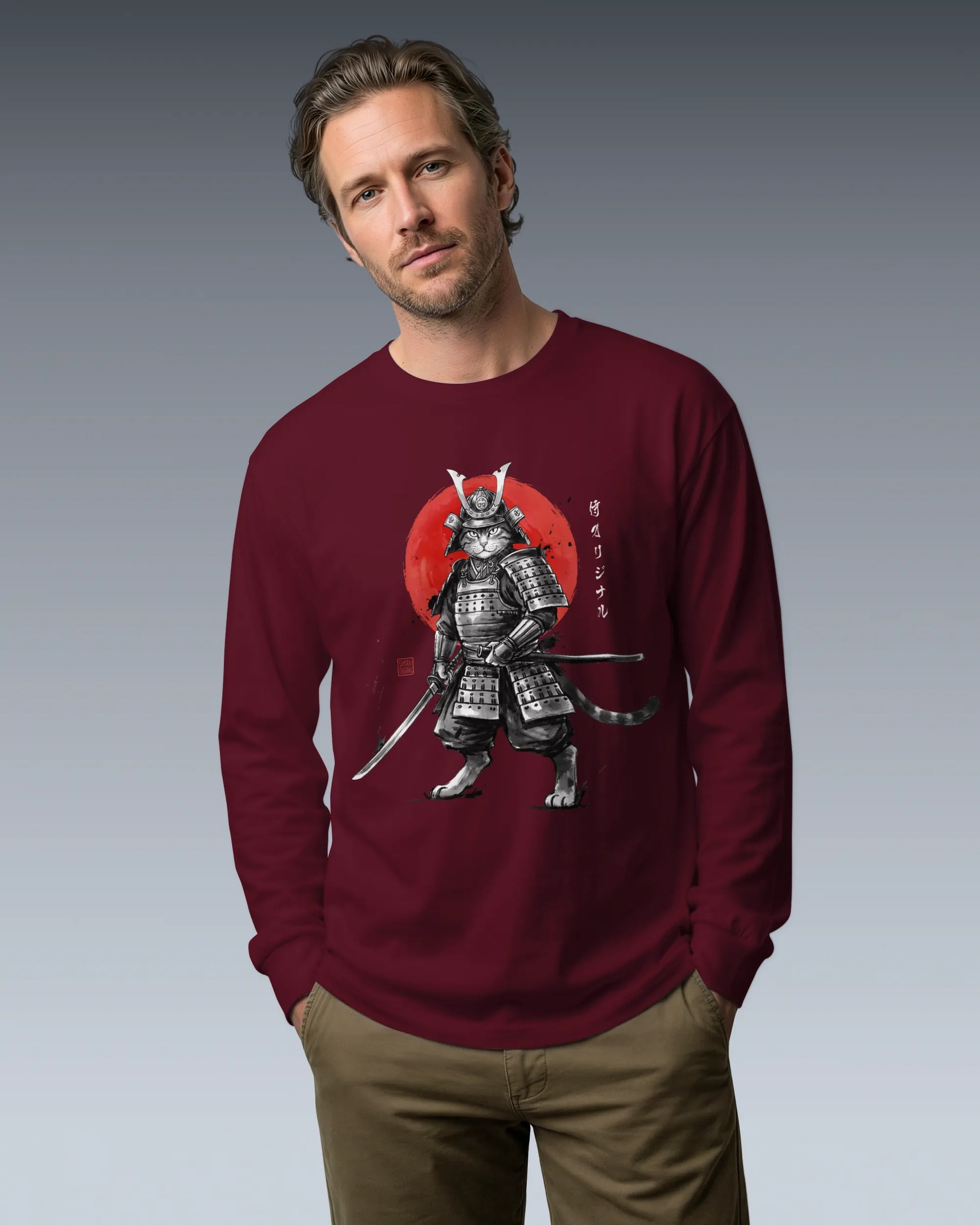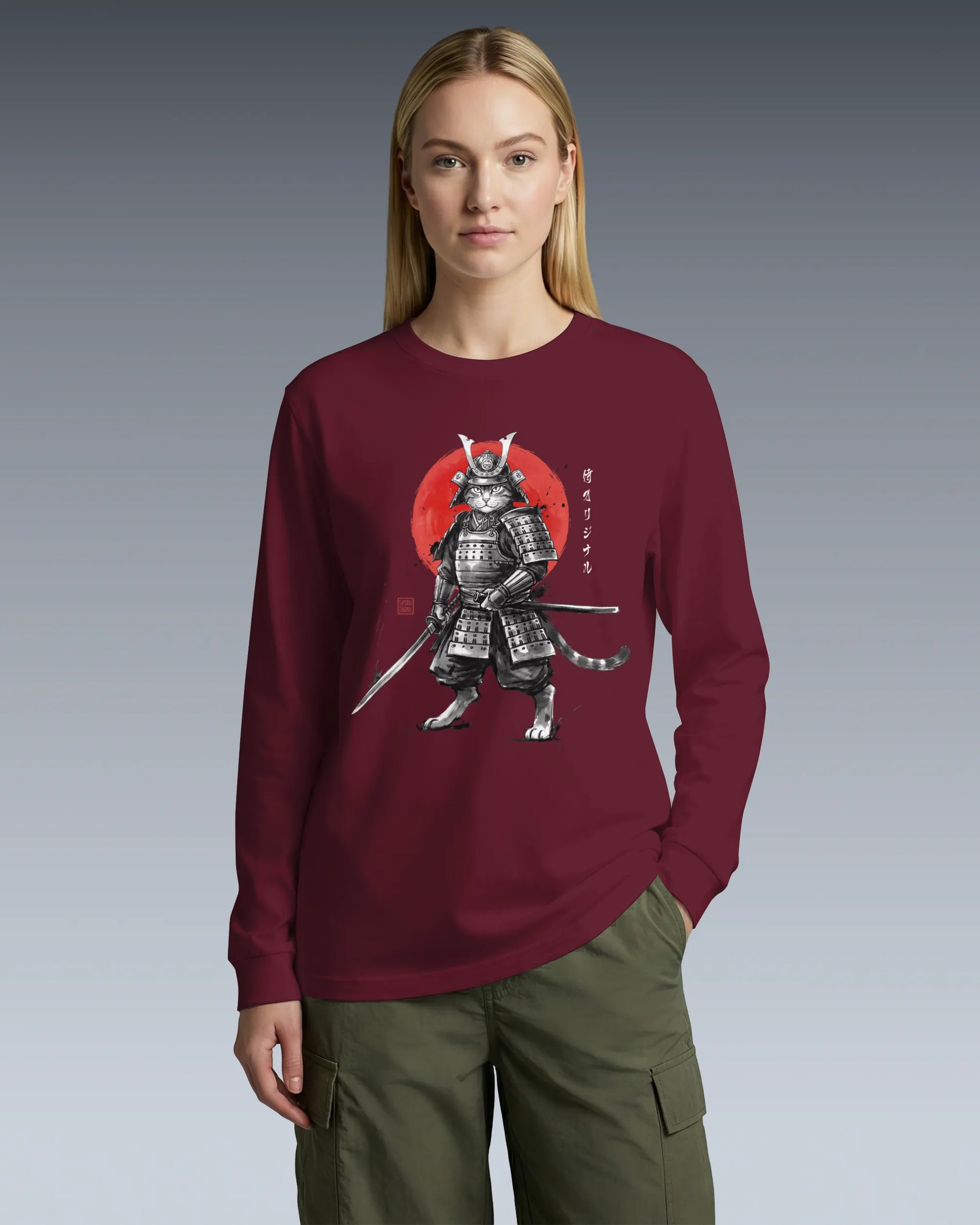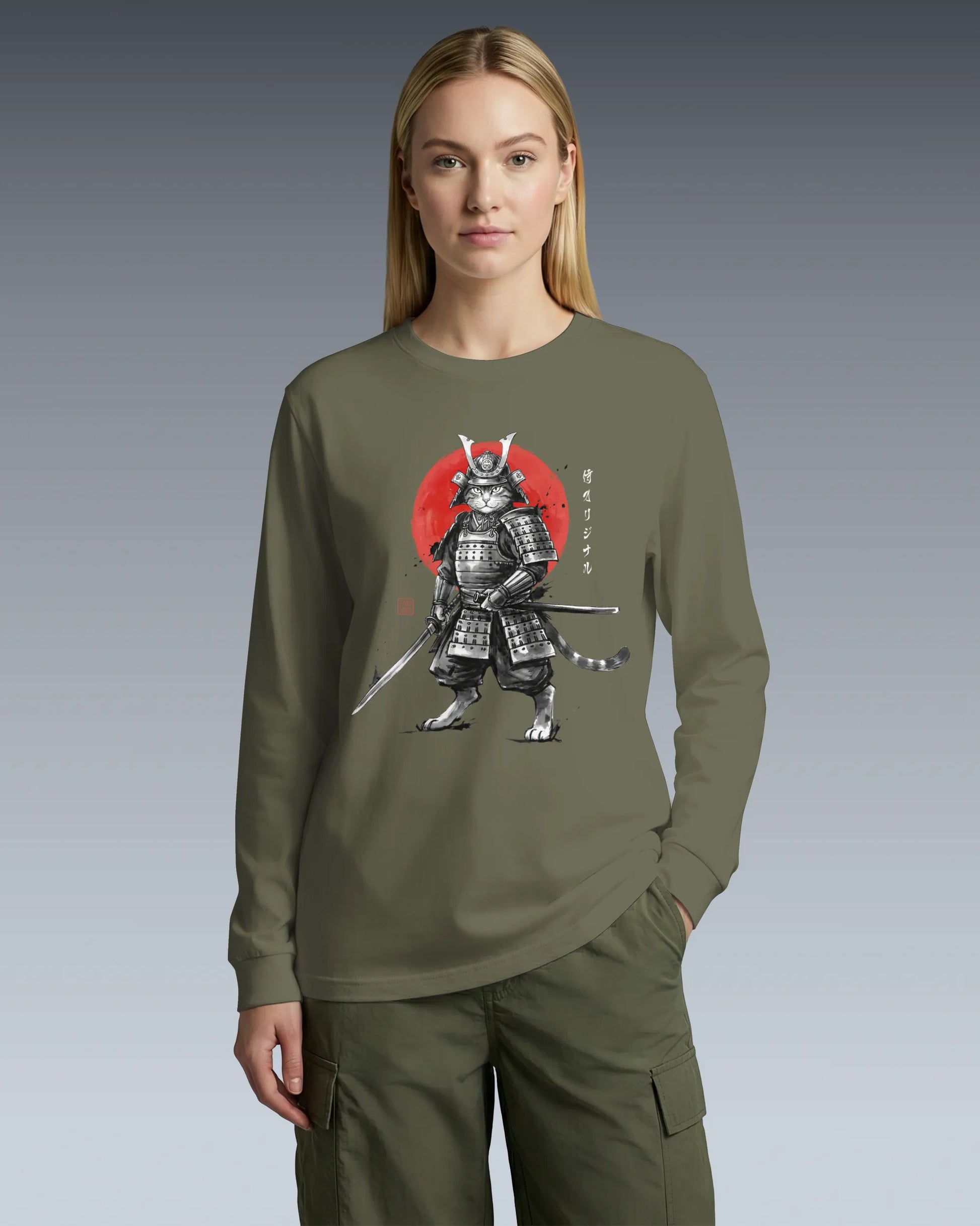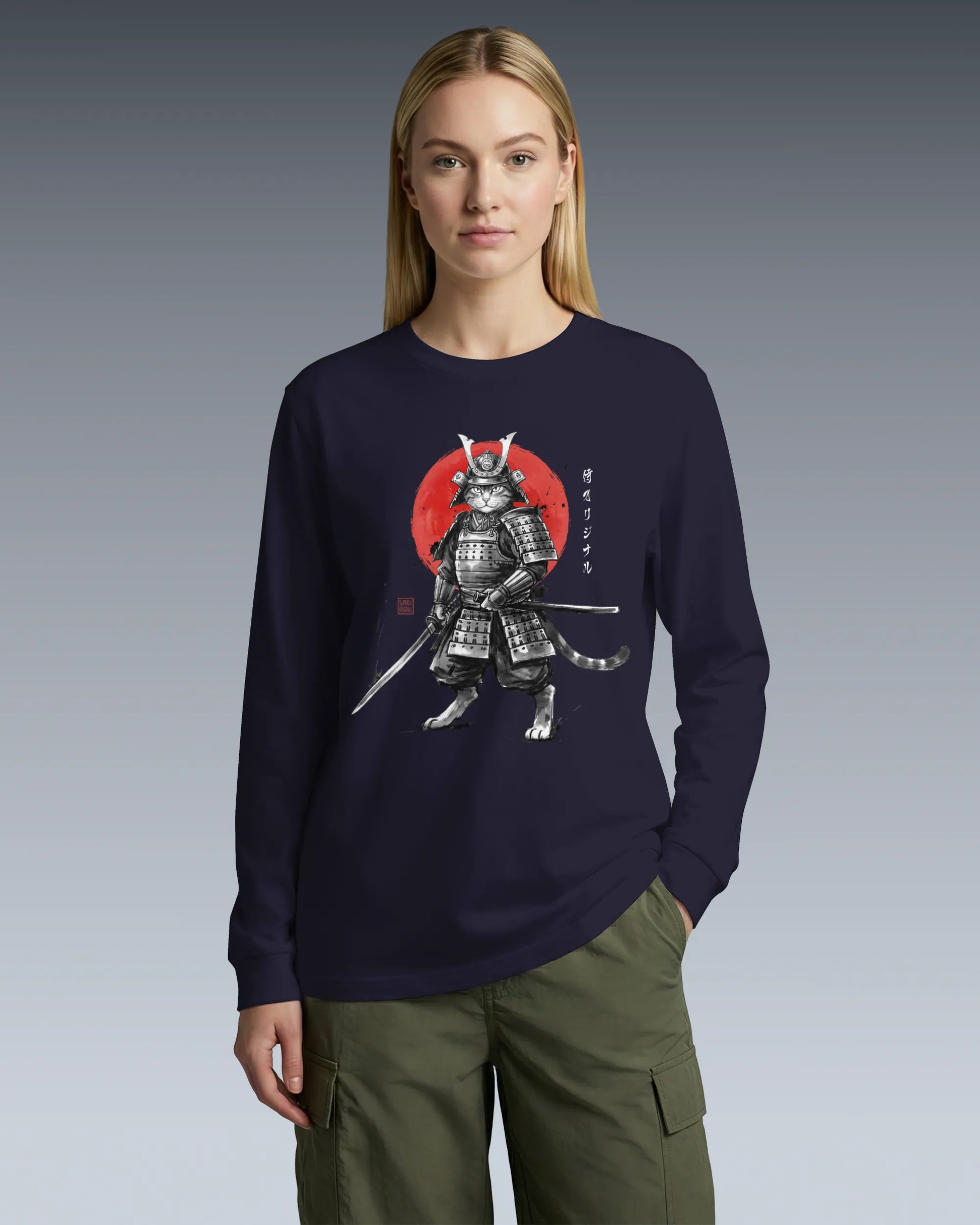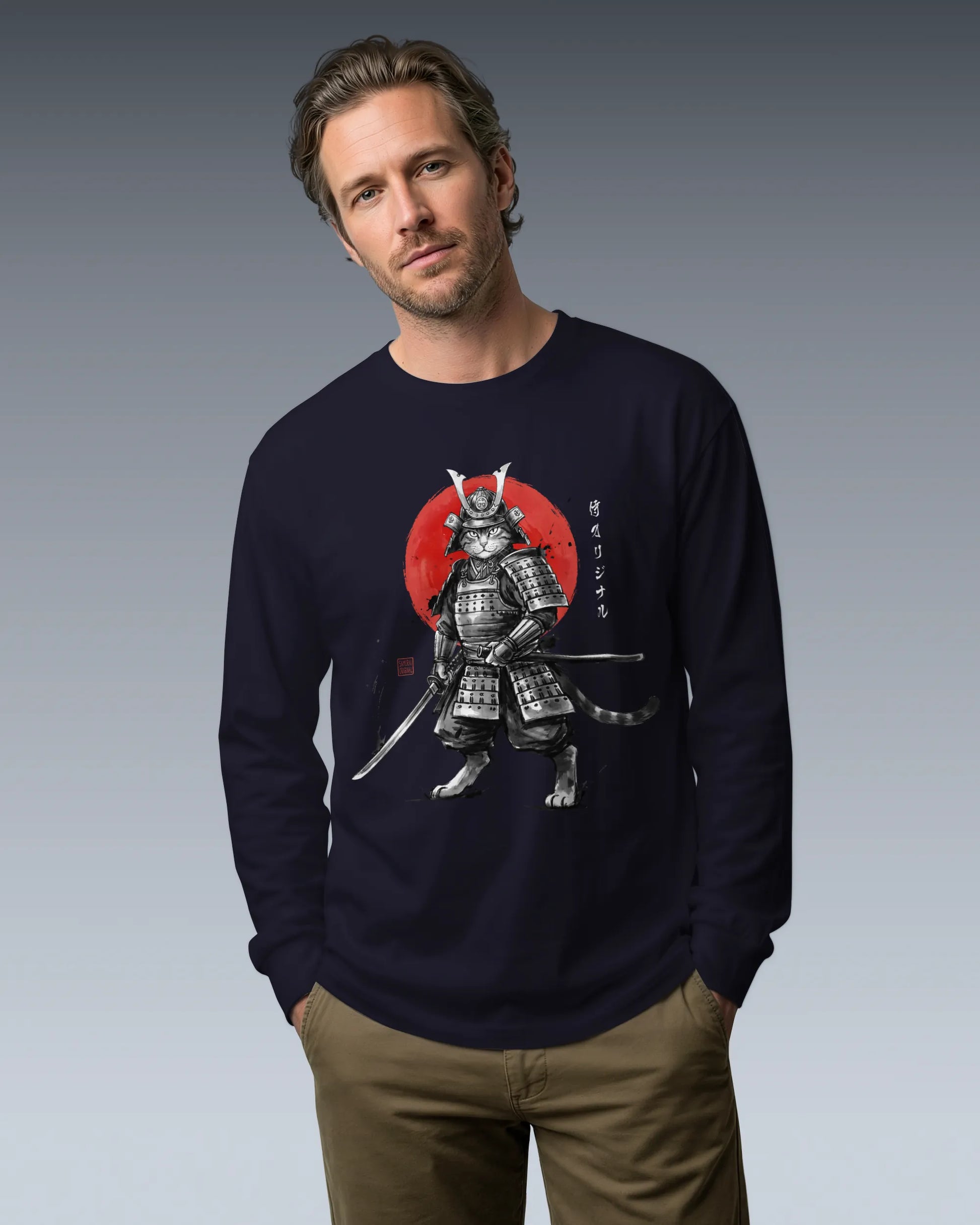 Cat Samurai Sumi-e Japanese Unisex Long Sleeve Tee