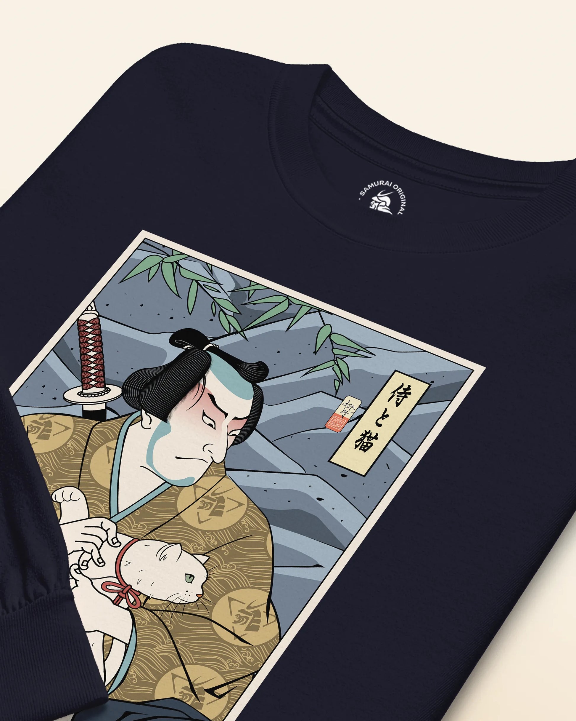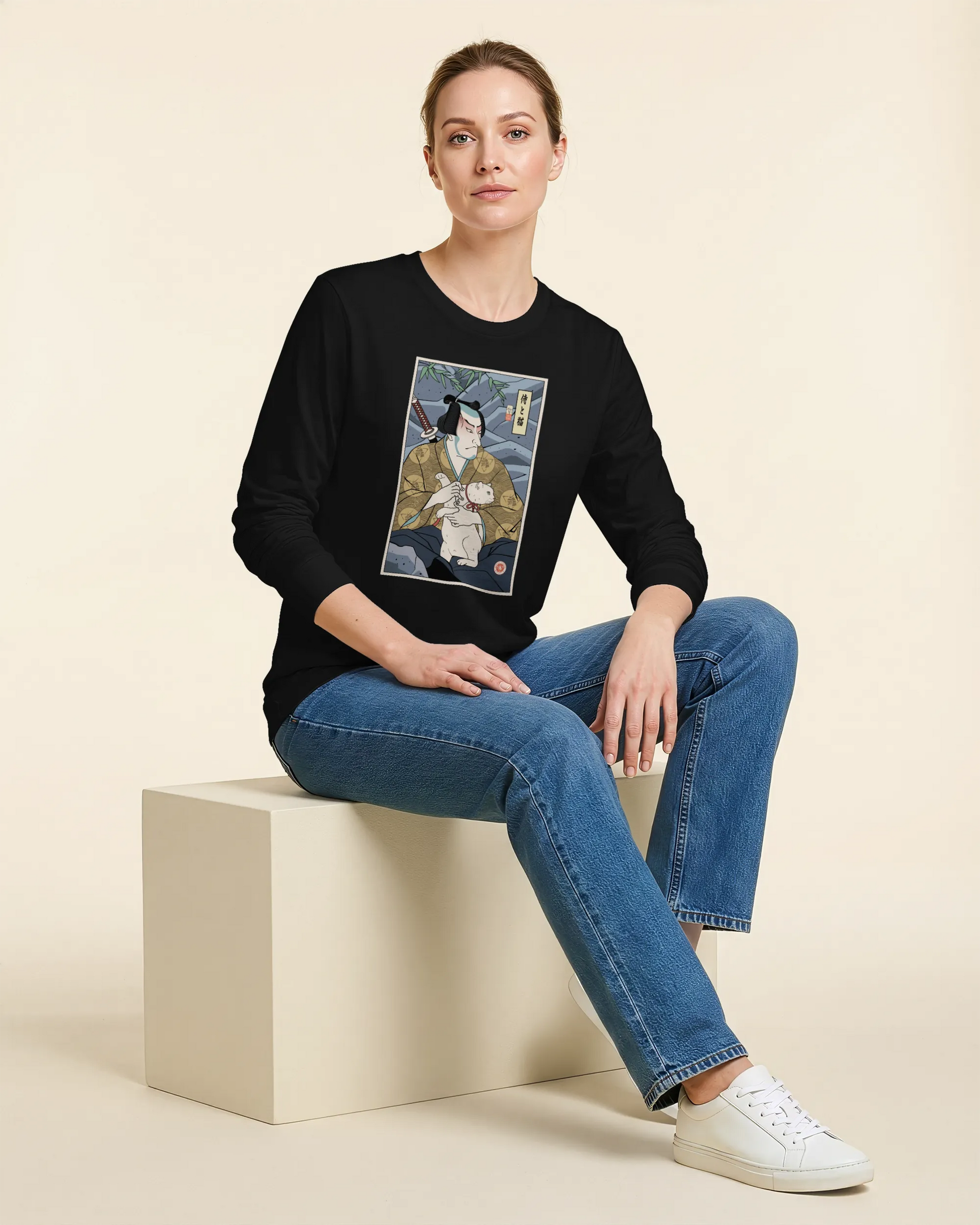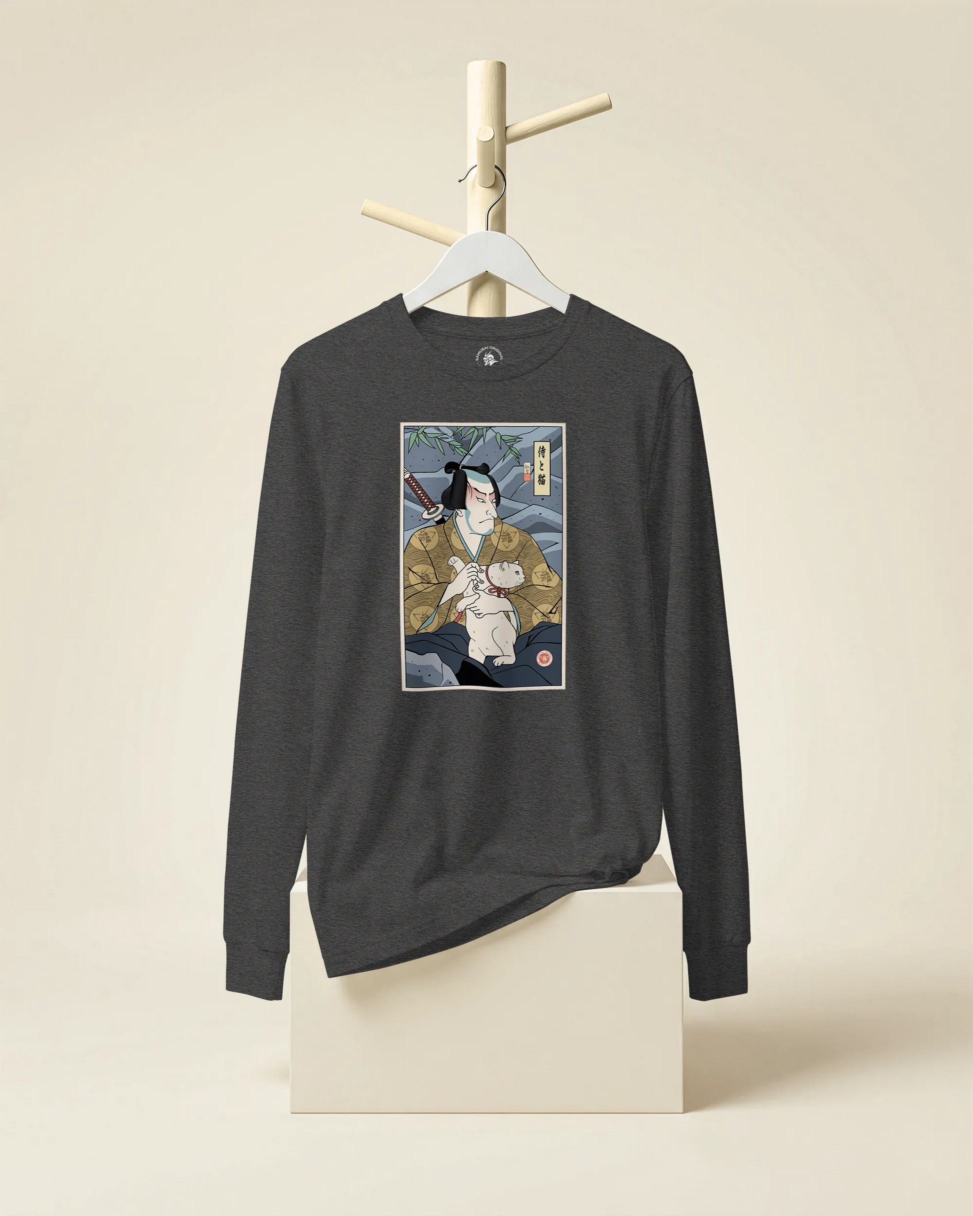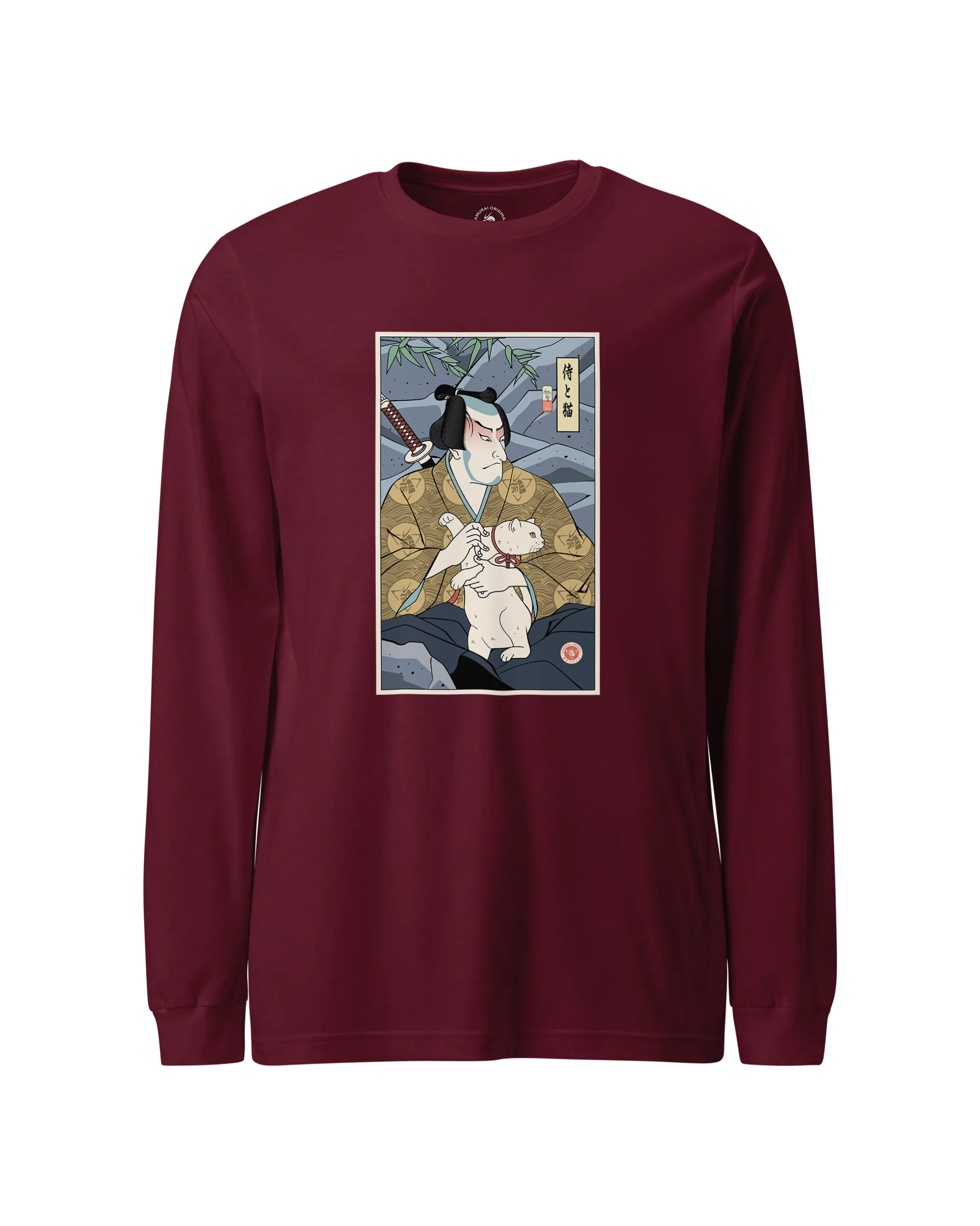 Samurai & Cat Funny Japanese Ukiyo-e Unisex Long Sleeve Tee