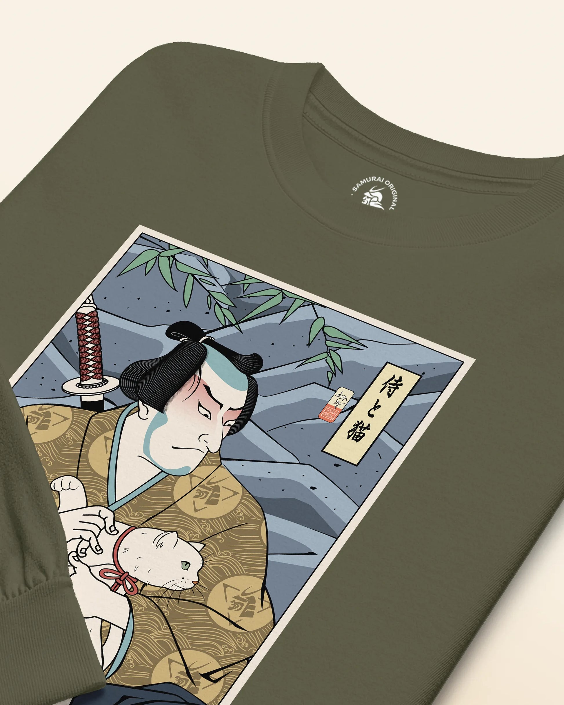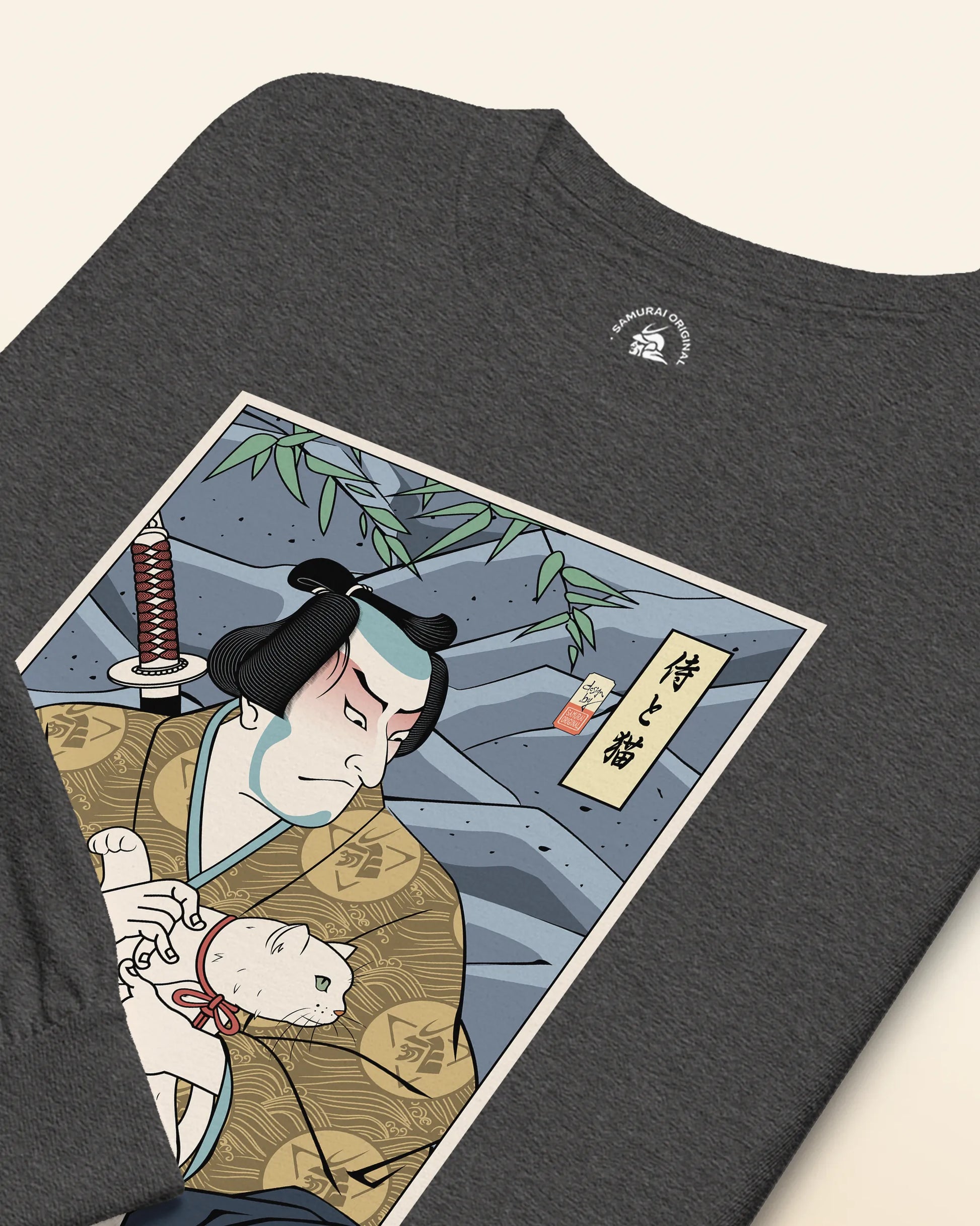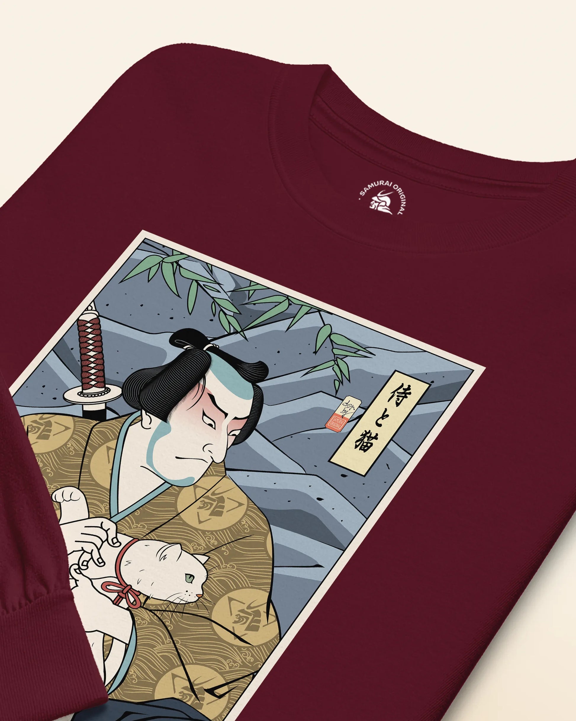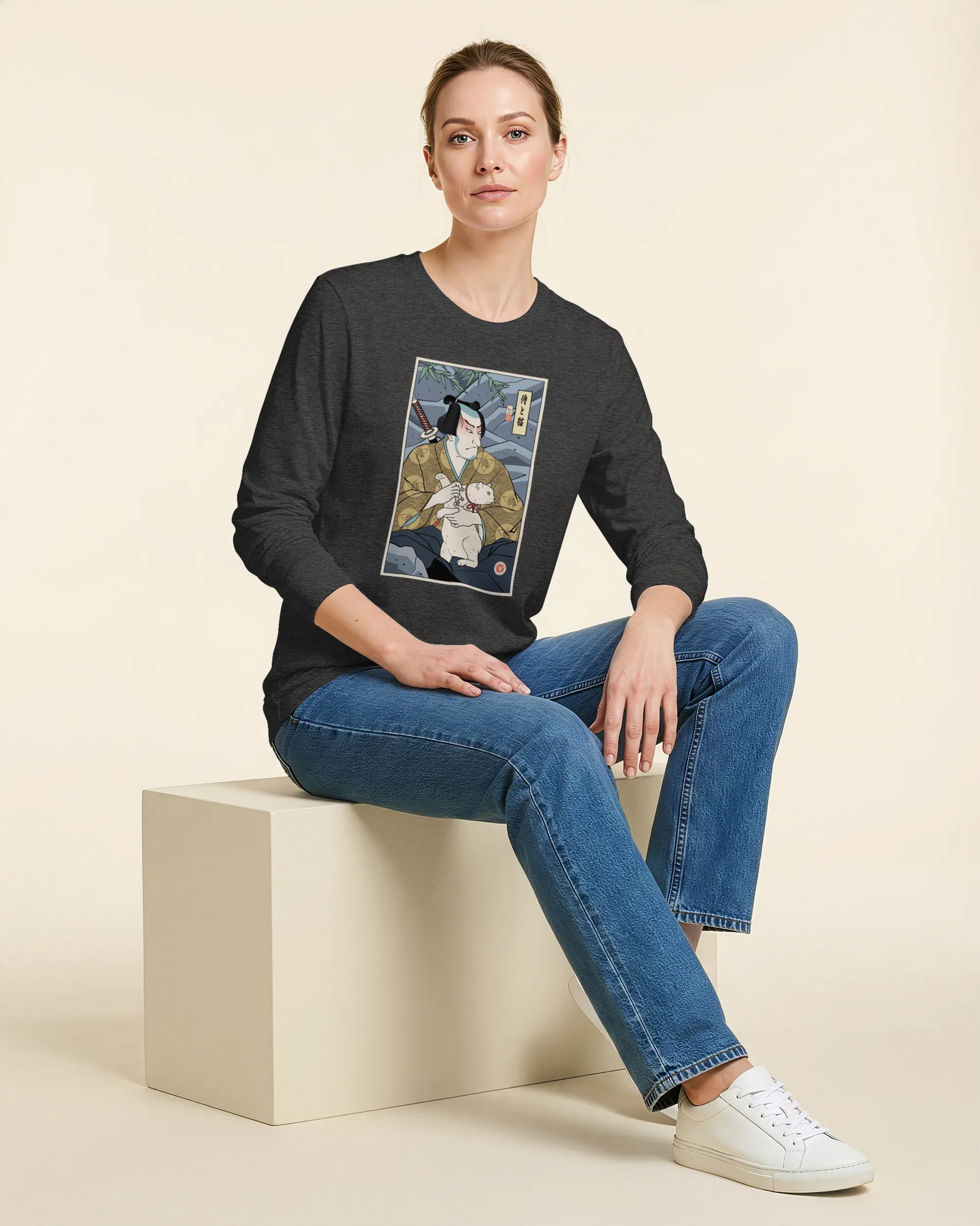 Samurai & Cat Funny Japanese Ukiyo-e Unisex Long Sleeve Tee